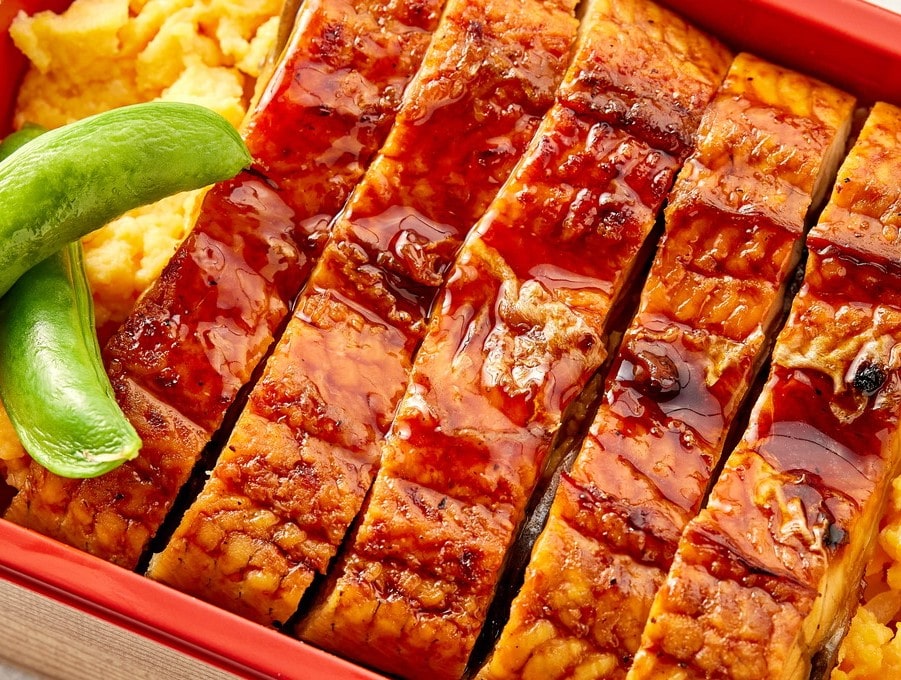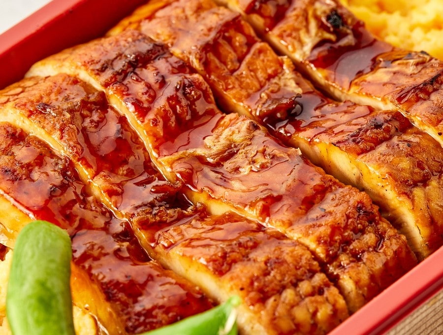 大きなウナギを半尾使用し、炭焼きにしました。卵との相性は抜群です。会議用の弁当やおもてなし弁当に最適です。