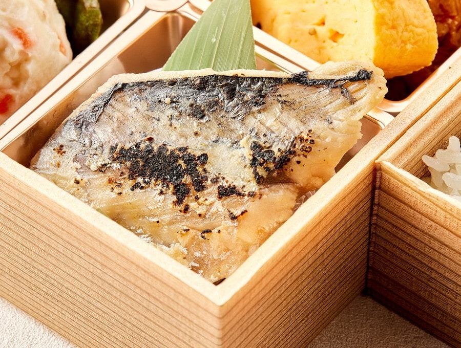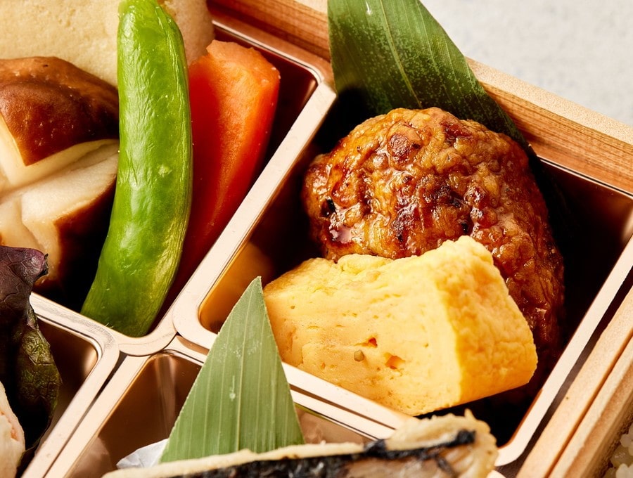 鰆西京焼き/高野豆腐/玉子焼き/野菜(ブロッコリー、ニンジン、えんどう)/鴨ロース/白ご飯/ポテトサラダ/つくね/味噌カツ/梅干し