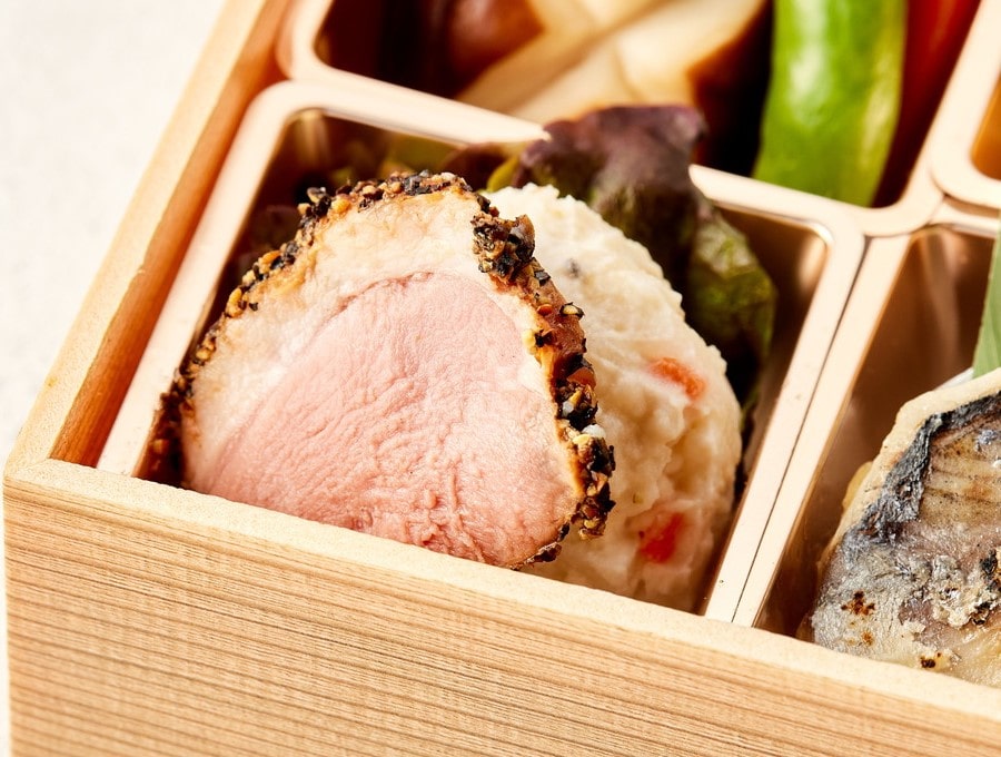 味噌カツ/鰆西京焼き/高野豆腐/うまき/野菜(ブロッコリー、ニンジン、えんどう)/オクラ/香の物/鴨ロース/名古屋コーチンプリン/ポテトサラダ