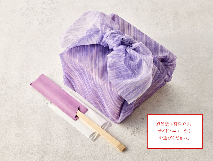 2段重は、風呂敷と高級割りばしもオプションでご用意しており、見た目も豪華です。おもてなし弁当や会議用の弁当、法事や法要にもおすすめです。